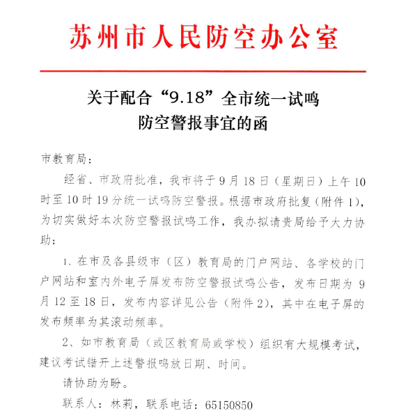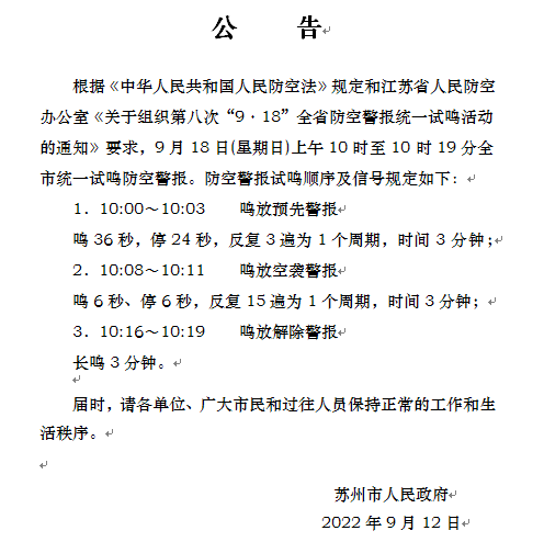 “9.18”全市统一防空警报试鸣活动公告