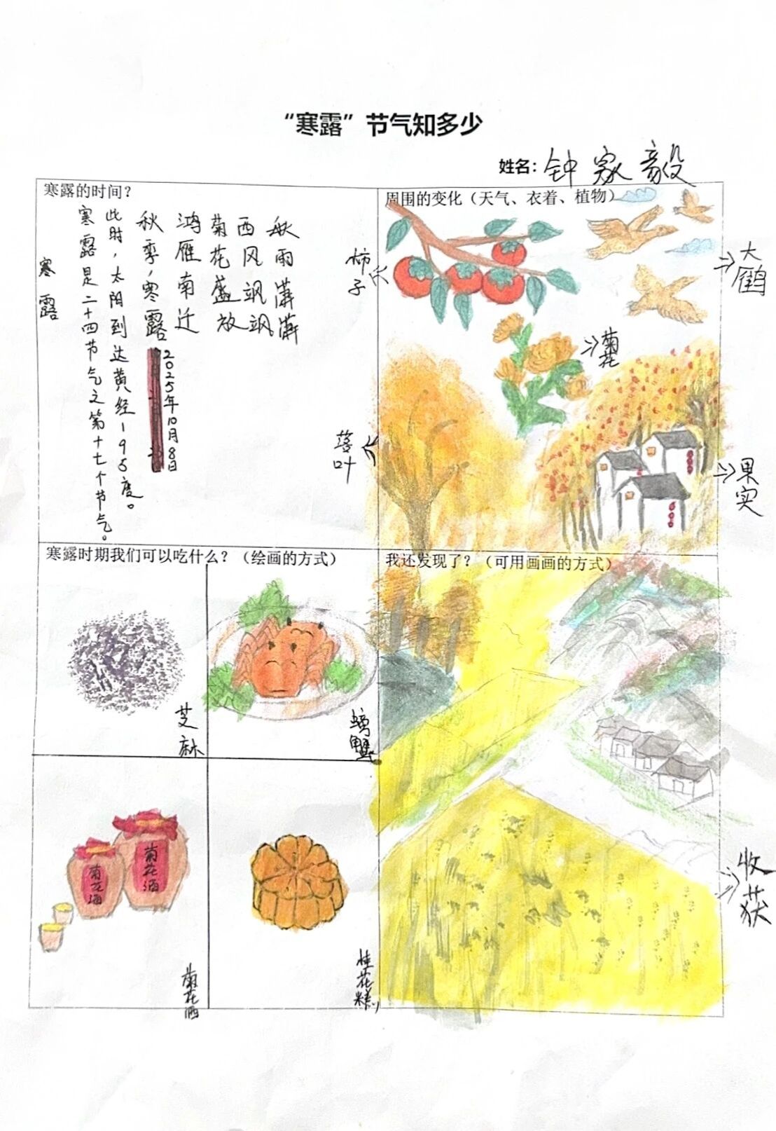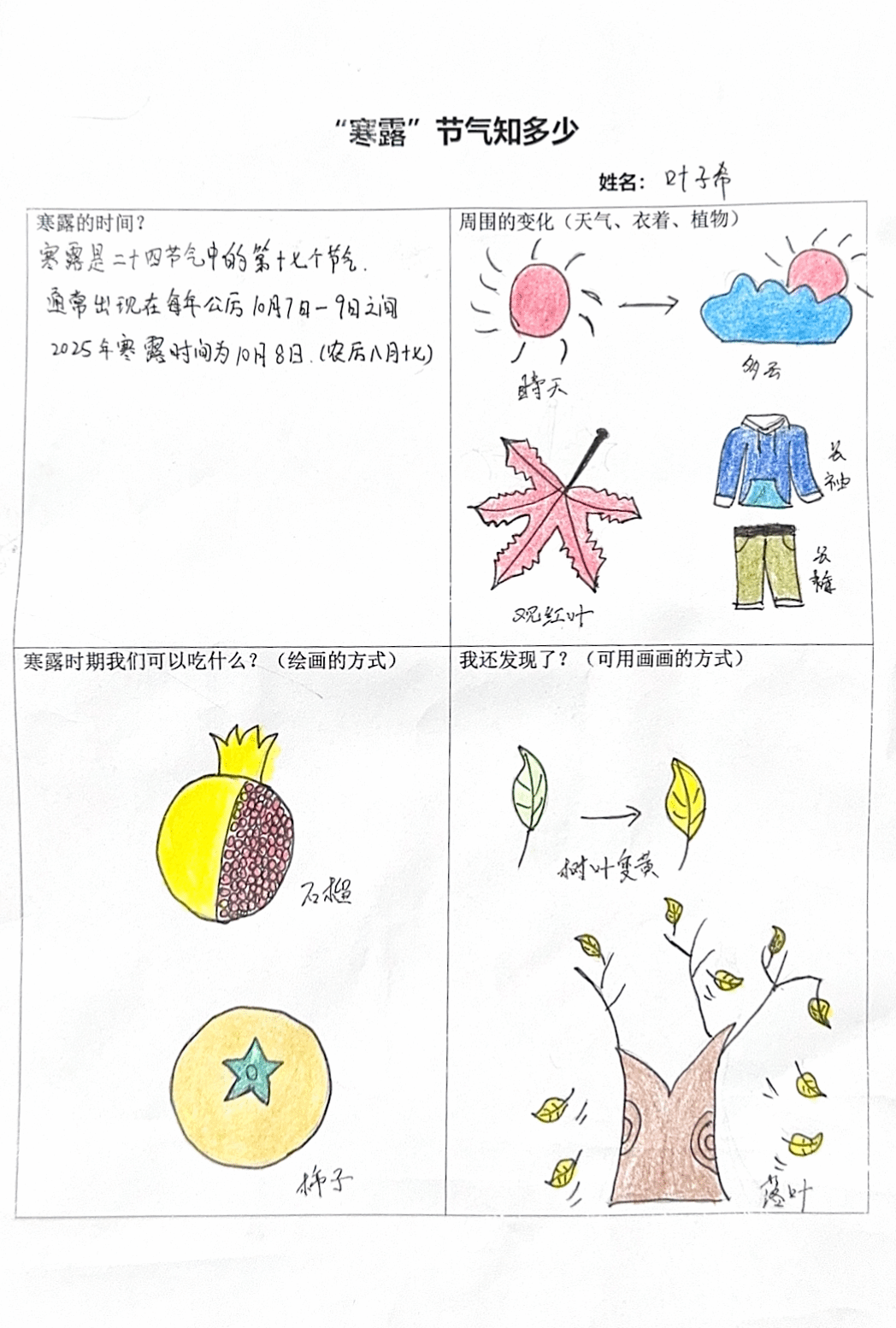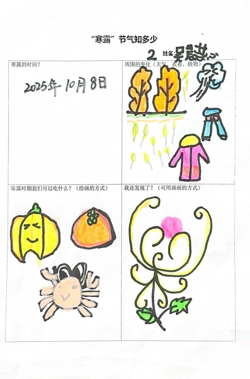 在孩子们初步了解寒露时节的基础上,又通过亲子方式搜集、查阅书籍等完成寒露节气的调查表,从而更深层了解了寒露的相关知识和习俗。