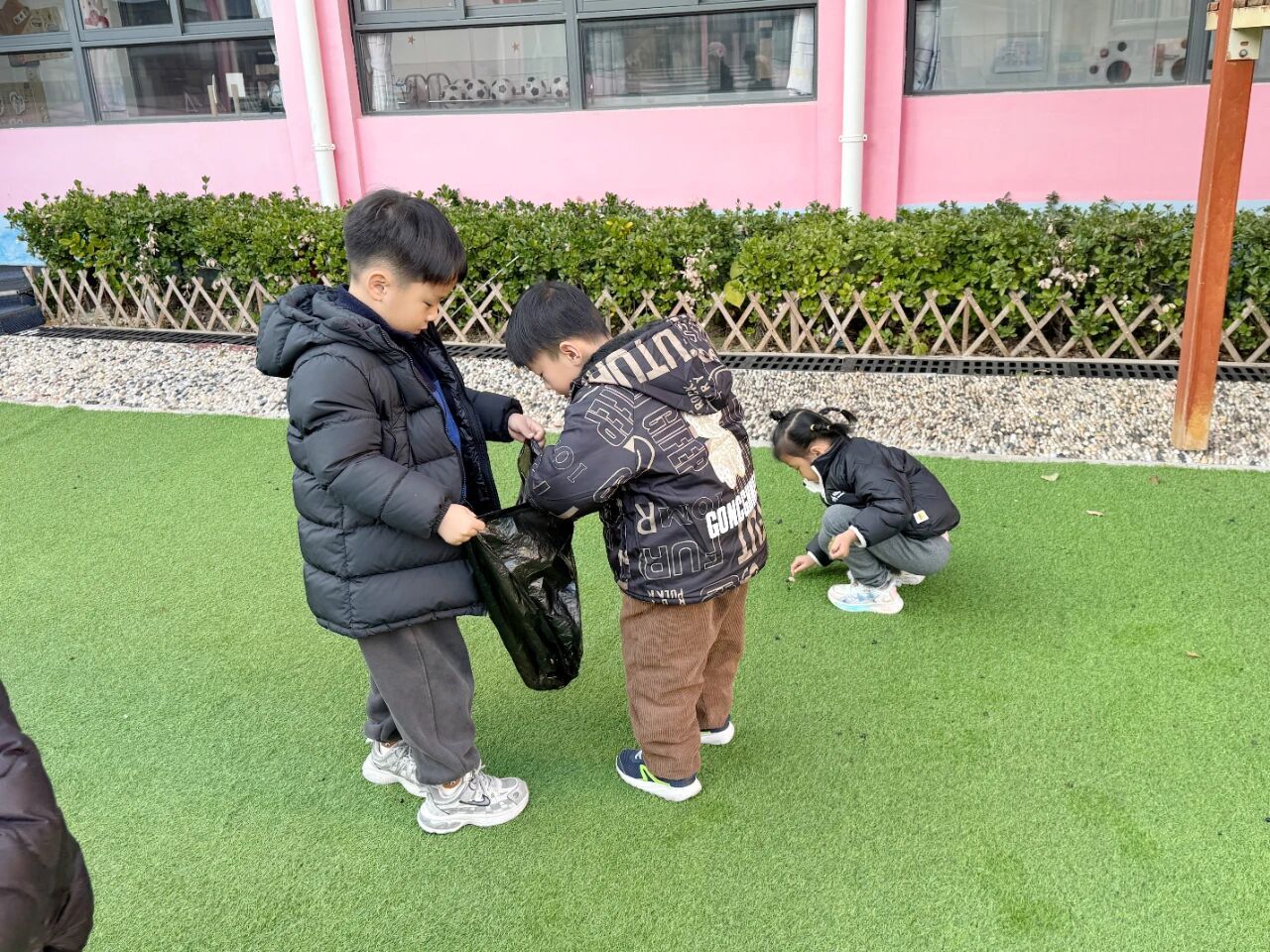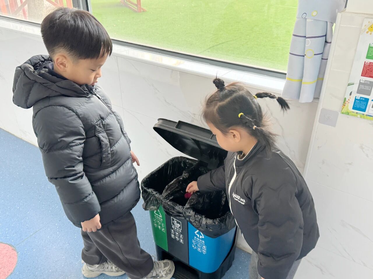 为了进一步践行垃圾分类,孩子们担负起监督垃圾分类的工作。他们来到幼儿园的班级、操场等地,检查幼儿园场地上的卫生情况,守护我们美丽的幼儿园。