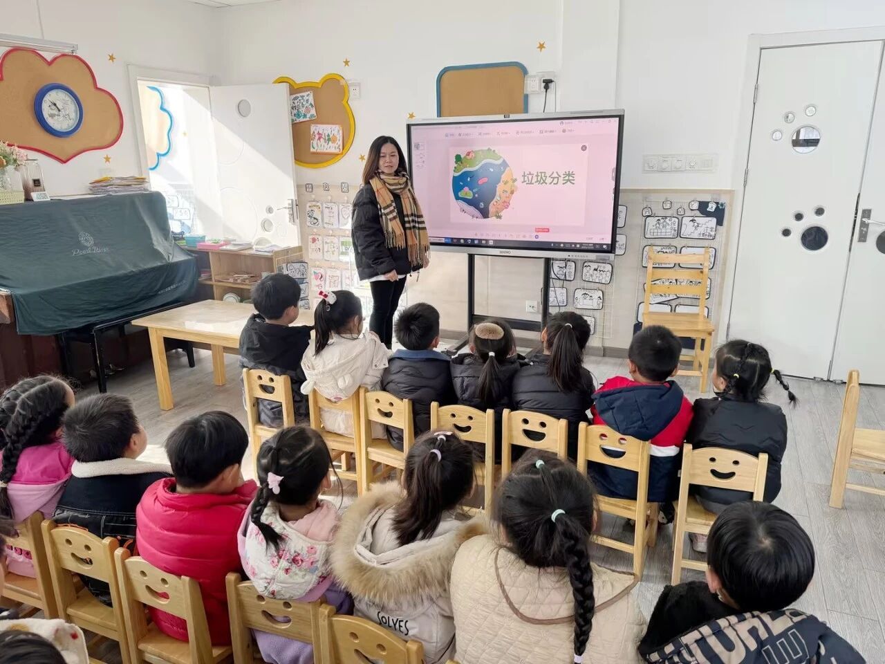 我们结合幼儿大班年龄特点,通过视频、图片等方式,展开主题教育活动,孩子们认真倾听,徐老师讲解垃圾桶的类型,了解垃圾桶有红、蓝、绿、灰四种颜色,每种颜色分别对应着不同种类的垃圾。
