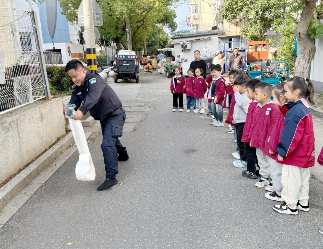 我园特邀东吴保安队长为孩子们带来了一堂生动的消防安全器材认知课。保安队长耐心细致地介绍了每种器材的名称、用途和使用方法,并进行了现场演示。孩子们在“看一看、听一听、摸一摸”的零距离接触中,加深了对消防器材的了解,消除了对救援装备的陌生感和恐惧感。