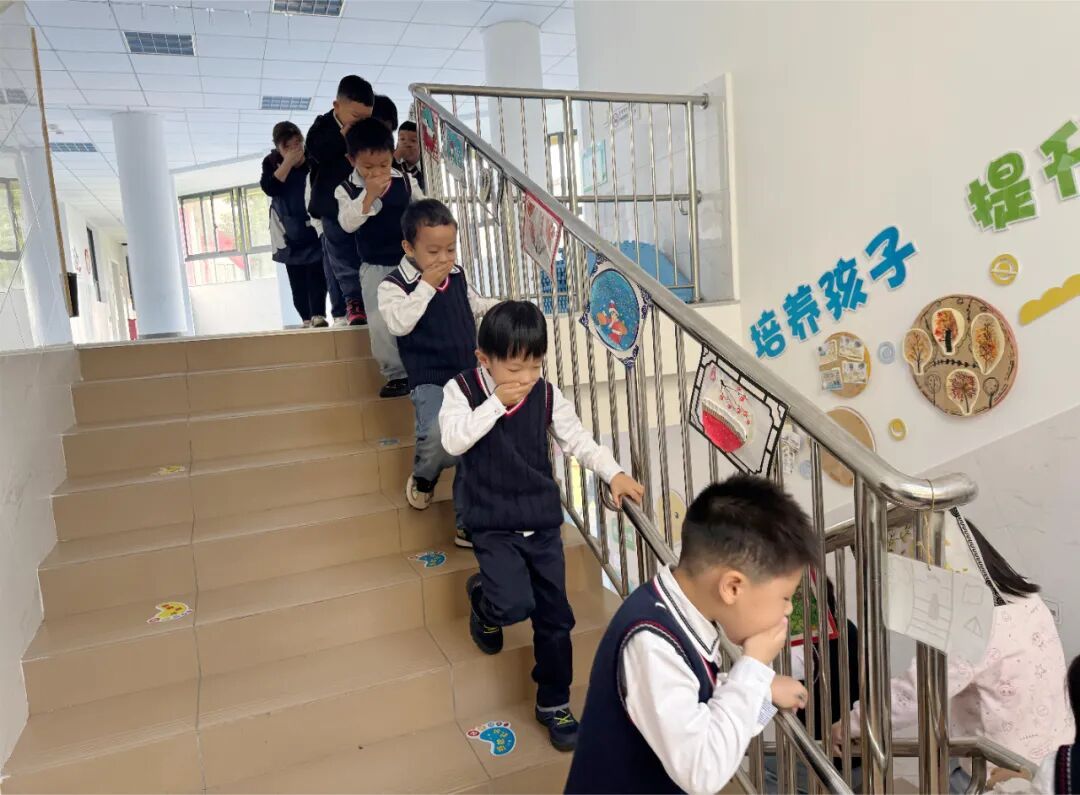 随着一阵急促的警报声突然响起,最考验实战能力的“突击消防逃生演练”正式开始!教师们迅速反应,冷静沉着地指挥幼儿捂住口鼻,弯腰低姿,沿着预定的疏散路线,快速、有序地从各个活动室撤离至安全地带。整个演练过程紧张而不慌乱,全体师幼均安全撤离。除了教学区,幼儿园食堂作为消防安全重点部位也同步开展了专项演练。食堂工作人员迅速关闭电子阀门,模拟扑灭灶具初起火灾,并有序撤离,体现了“全员参与、重点防控”的原则。演练结束后,总指挥进行了现场总结,肯定了师幼们在演练中的沉着表现和快速反应,同时也针对演练细节提出了优化建议。